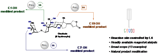 钮大文教授团队在这一领域进行了长期的研究,并取得了系列进展。近日,该团队在此领域获得了新突破。受生物学中常用的基因编辑工具启发,该团队使用各种小分子添加剂模拟guide RNA的功能,实现了对多个重要天然产物的位点可调控修饰。例如,使用三种不同的硼酸,他们完成了对抗肿瘤活性分子Ouabain三个不同位点的精准修饰,获得了一系列衍生物。该团队正与其他团队合作,对这些衍生物的抗肿瘤活性进行研究。