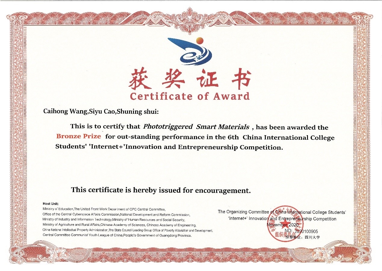 王彩虹老师的参赛项目“Phototriggered Smart Materials”获全国总决赛铜奖,成为NT动漫