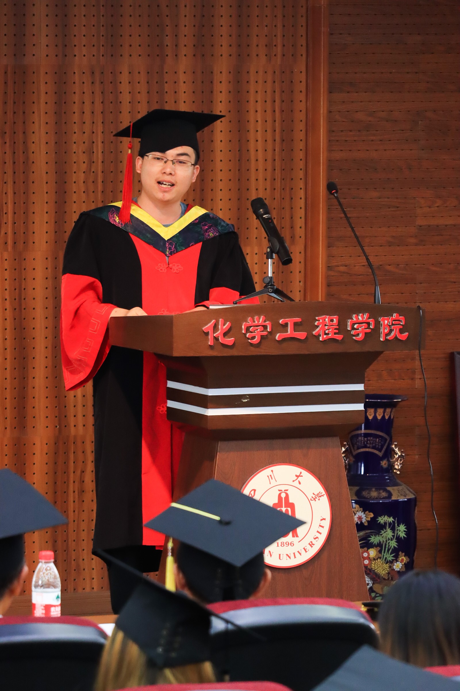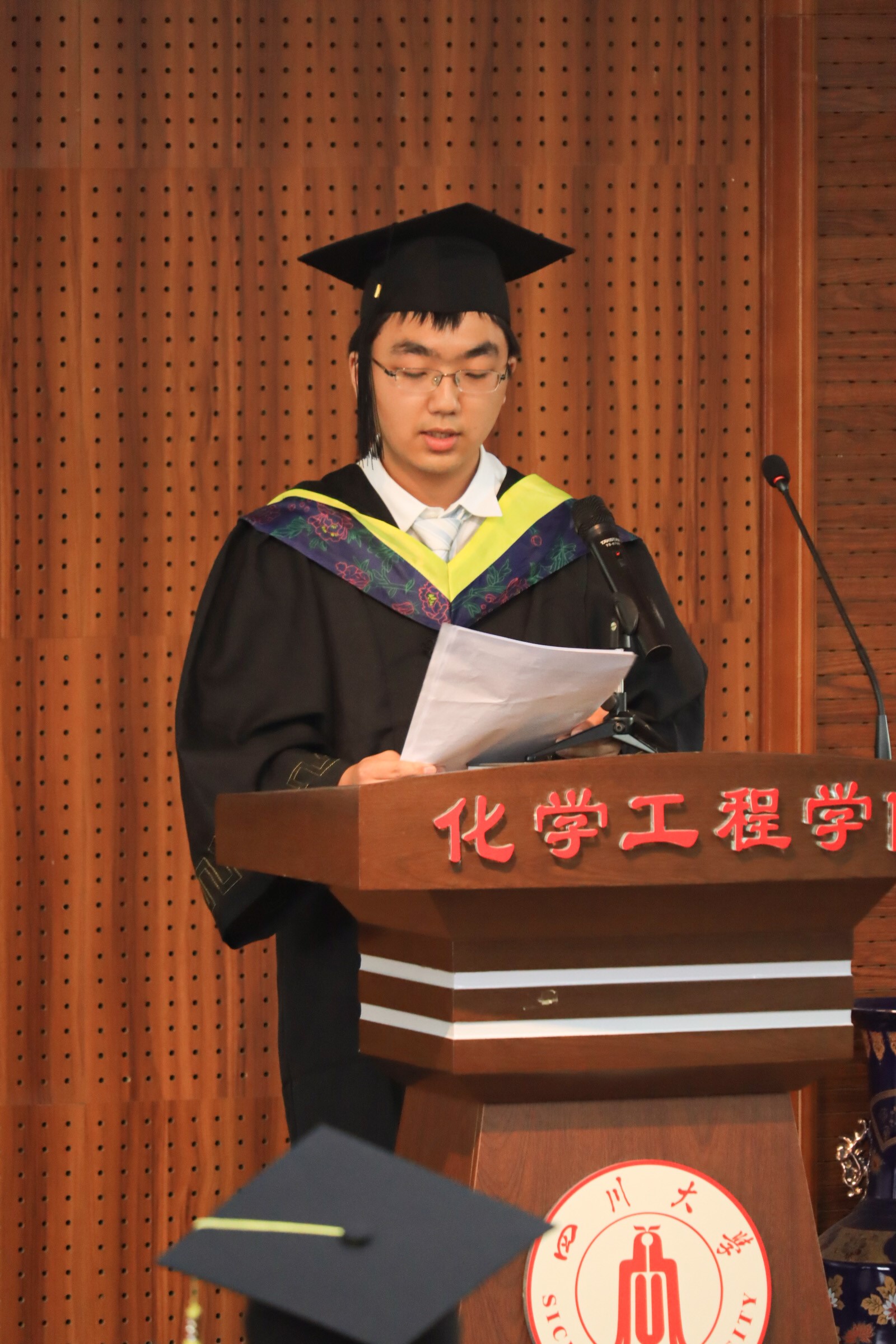 毕业研究生学生代表王玉滨上台发言,他提到师长对他说过这样一番话,“我们的老师们用了30年的时间把中国的化工从无做到了有,我们这一辈用了30年的时间把中国的化工从有做到了大,我希望你们这一辈也用30年的时间把中国的化工从大做到强。”今年是建党100周年,作为下一个百年征程的第一批毕业生,承前启后,肩负着神圣而伟大的历史使命,应当承担起应有的责任,在这个激扬奋发的时代,为中国梦、化工梦而不懈努力!