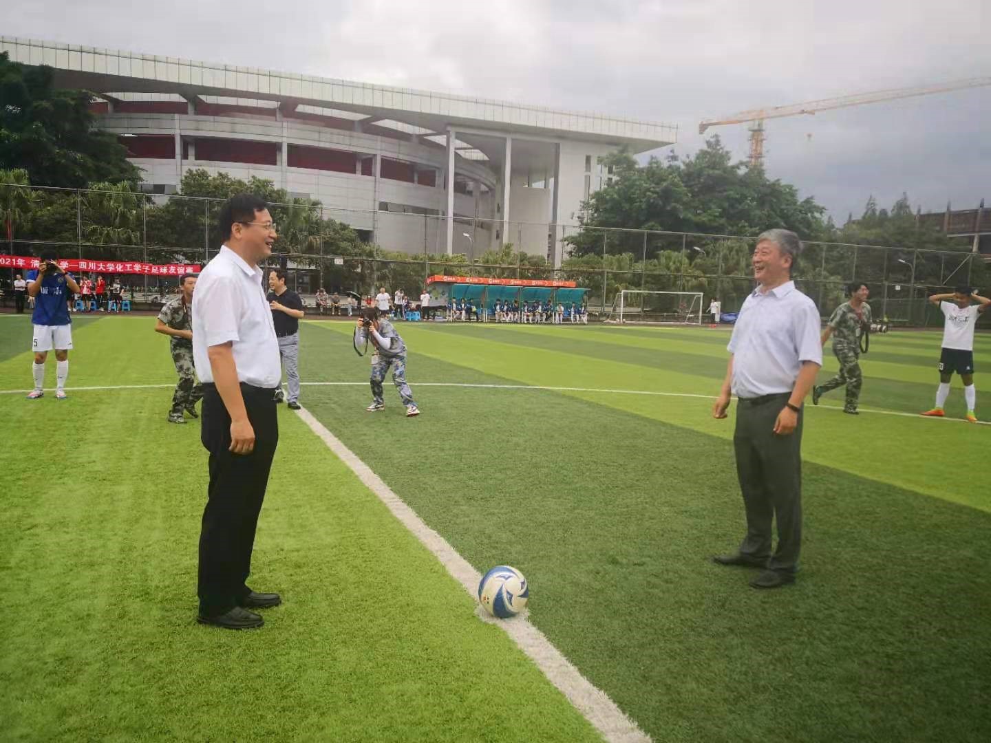 图2.川大化工党委书记庞国伟老师与清华化工党委书记王玉军老师友好开球