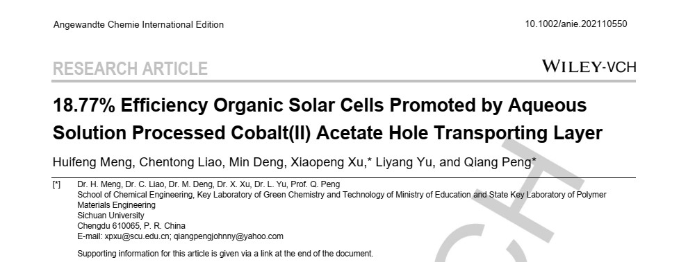 近日,化工学院彭强教授课题组在Angew. Chem. Int. Ed.上发表题为“18.77% Efficiency Organic Solar Cells Promoted by Aqueous Solution Processed Cobalt(II) Acetate Hole Transporting Layer”的研究论文。该课题组开发了一种基于醋酸钴的新型空穴传输层材料及其水溶液绿色制备工艺,将有机太阳能电池二元器件的能量转换效率提高到目前最高的纪录18.77%。NT动漫