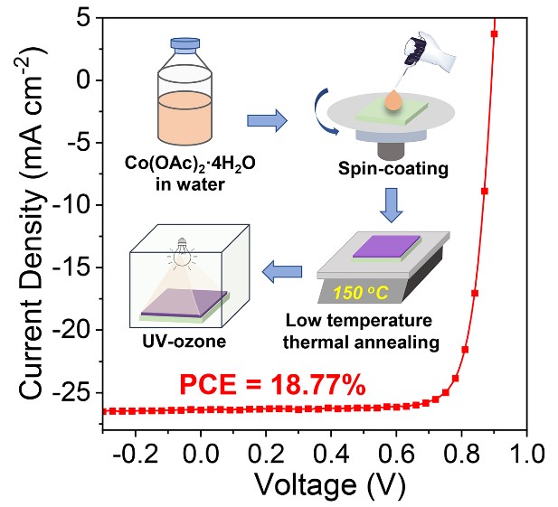 化工学院彭强教授课题组以低成本的Co(OAc)2·4H2O为原料,简单制备出了一种高效耐用的空穴传输层材料。该制备工艺是将Co(OAc)2·4H2O水溶液涂布在透明ITO电极上,通过热退火除去其中的结晶水,并通过紫外臭氧处理使该空穴传输层部分氧化,显著增加其功函数。此工艺所制备的基于钴的空穴传输层具有良好的光透过率、高的导电性以及低的表面缺陷,促使所制备的有机太阳能电池的开路电压、短路电流密度、填充因子都显著提升,最终获得了高达18.77%的能量转换效率,是目前有机太阳能电池二元共混器件效率的世界记录。该空穴传输层的制备条件工艺简单、成本低廉、适用于PET等柔性基底,具有制备大面积柔性器件的潜力。