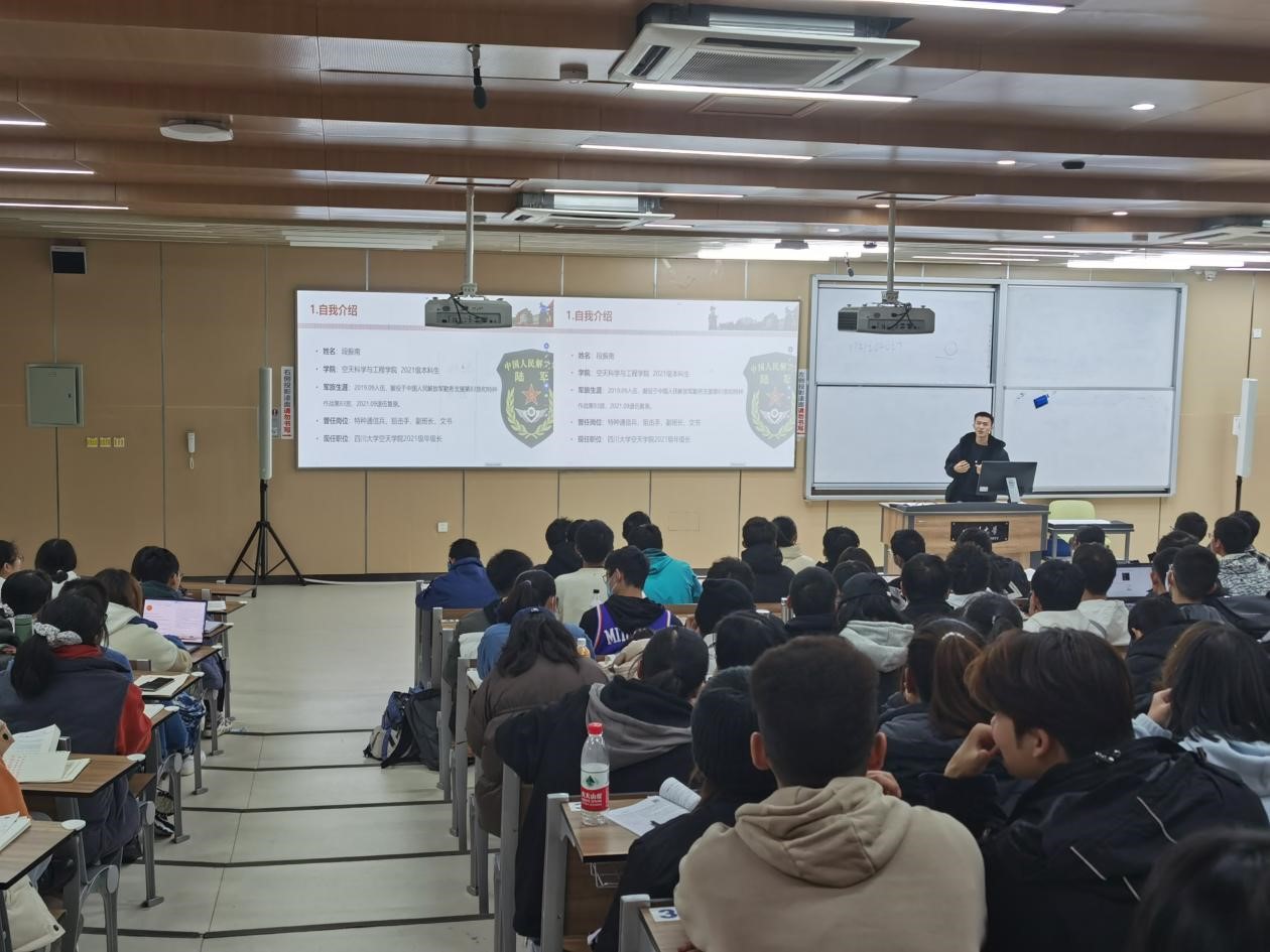 征兵宣讲团2019级学生王承宇和2021级段振南,分别于江安校区综合楼C座403室和106室,进行了一场别开生面的爱国主义教育专题讲座。