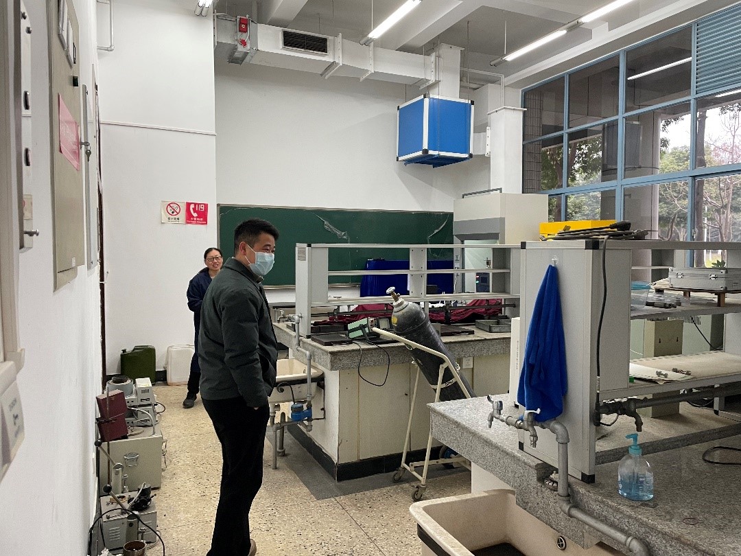 郭孝东副院长、安全组成员位爱竹老师及工程实验中心田文老师对江安校区第一基础实验楼B座的实验室开展了全面的安全检查工作。