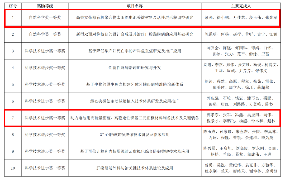 彭强教授等完成的“高效宽带隙有机聚合物太阳能电池关键材料及活性层形貌调控研究”获四川省自然科学奖一等奖;郭孝东教授等完成的“动力电池用高能量密度、高稳定性镍基三元正极材料制备技术及关键装备”获四川省科学技术进步奖一等奖。