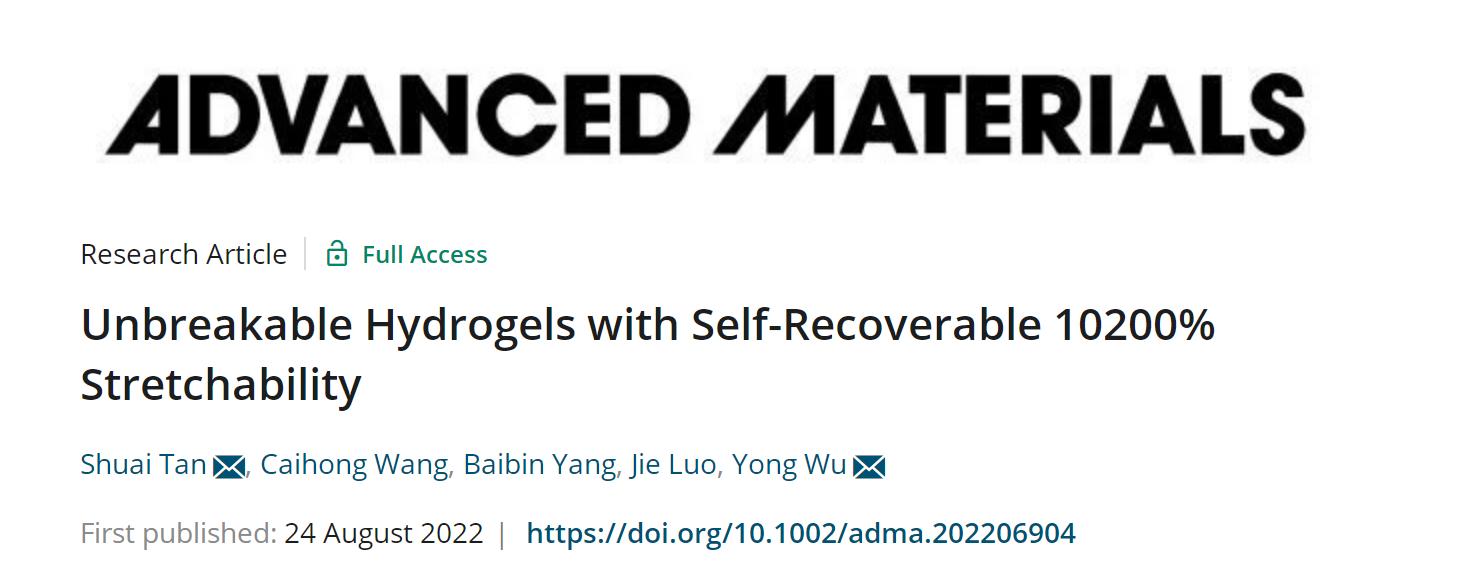 化工学院伍勇教授/谭帅副教授提出了一种通过疏水共价交联构建高强度抗疲劳水凝胶网格的新方法,并系统的研究了水凝胶的延展性、韧性、自恢复性和抗疲劳裂纹扩张等特性,阐明了水凝胶内能量耗散的详细机制。相关研究成果“Unbreakable Hydrogels withSelf-Recoverable 10200% Stretchability”发表在《Advanced Materials》上,NT动漫