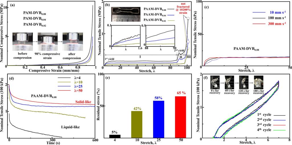 图2(a)水凝胶的压缩性能;(b)水凝胶的拉伸应力-应变曲线;(c)在不同拉伸速度下的标称拉伸应力-应变曲线;(d)水凝胶在不同拉伸值下的应力松弛曲线;(e)水凝胶应力松弛后的残余应力;(f)水凝胶的循环拉伸应力-应变曲线