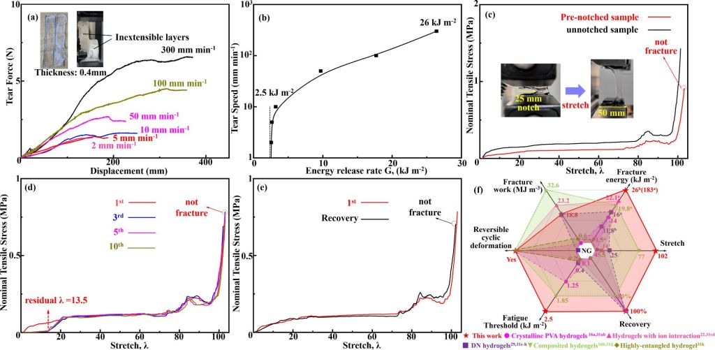 图3(a)水凝胶在不同撕裂速度下的撕裂力-位移曲线;(b)不同撕裂速度下的能量释放率速度;(c)预刻槽和无缺口水凝胶的拉伸应力-应变曲线;(d)预刻槽水凝胶的循环拉伸应力-应变;(e)自恢复预刻槽水凝胶的循环拉伸应力-应变;(f)水凝胶的拉神断裂功、韧性、循环拉伸性、自恢复性能、疲劳阈值、延展性的性能比较