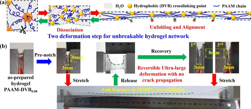 图1(a)具有可恢复的超高拉伸性的高强度水凝胶中能量耗散机制的示意图,和(b)预刻槽水凝胶的循环超高拉伸和自恢复性能