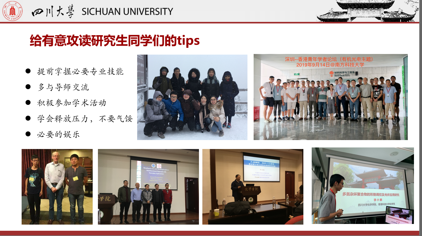 首先,徐老师以川大学长的身份与学弟学妹们分享了自己整个大学生涯及研究的心路历程。他图文结合讲述了自己初入大学的迷茫、对未来的困惑以及通过努力学习顺利考上研究生的大学时光,以自己的亲身经历激励新生学弟学妹们珍惜大学时光、刻苦钻研、绽放青春。随后又分享了读研期间所遇到的各种压力与挫折,讲述了在导师的指引下克服困难、刻苦研究,最终取得丰硕成果的研究生阶段,鼓励同学们学会面对挫折、克服困难、迎难而上、勇攀高峰,最终实现自我人生价值。