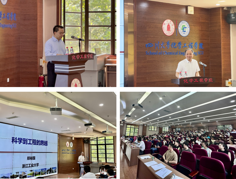 首先,褚良银教授对郑裕国院士进行了详细地介绍。郑裕国教授是中国工程院院士,生物化工专家,长期致力生物制造工程技术创新,引领了我国工业生物技术产业的发展。随后,郑院士从科学和工程的定义和特点出发,阐述了“科学发现-技术产生-创新创造”的科学到工程的路径发展;之后基于“从微生物学到微生物发酵工程”和“从酶学到酶工程”,通过青霉素、阿维菌素、井冈霉素和腈转化酶的发现、发展与工业化应用的具体事例,提出工程创新是解决瓶颈,实现工业化应用的必经之路。郑裕国院士指出从科学到工程的路径发展是符合人类认知规律,改造世界、创造价值的必然途径,从工程大国走向工程强国是当代中国工程科技领域一项重要战略任务,要求综合科学理论与技术手段,转化为直接生产力,造福社会。最后,郑裕国院士与学院师生进行了充分的交流和讨论。