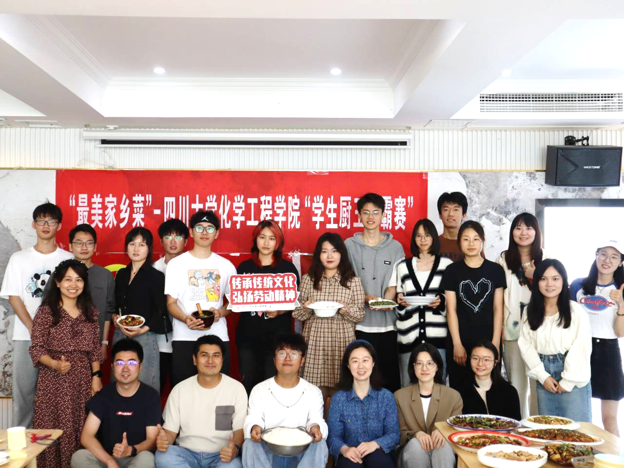 党委副书记姜利寒老师,学生科科长帕哈尔定老师、团委书记李珍珍老师,辅导员李颖丽老师、李忆雯老师、雷金凤老师、付率老师和袁玲老师担任本次比赛的嘉宾和评委。参赛选手们不仅要烧得一手惊艳四座的好菜,同时还需在团队合作、分工布局等方面开动脑筋。赛场上,选手们个个精神抖擞,信心十足。操作过程中,参赛选手有条不紊,动作娴熟,充分发挥自身的精湛厨艺。挥铲舞勺,刀片切碰砧板的铿锵之声不绝于耳,现场气氛热烈。烹饪,装饰,摆盘,一气呵成,一道道独具风味的家乡菜肴在选手们娴熟的技艺中纷纷亮相。比赛结束后,评委桌上品种丰富,造型独特,色香味俱全的美味佳肴更是让人流连驻足,由杨渝敬和庞璇同学制作的——辣子鸡获得本次比赛的“最受好评奖”,由庞毅荣同学制作的——糖醋排骨获得“最色香味俱全奖”,由陈星伊和赵子淳同学制作的——炒烤肉获得“最先吃光奖”,由张雪和徐智豪同学制作的——地三鲜获得“最具风味奖”,由余嘉琪同学制作的——江西滑肉获得“最具家乡特色奖”,由王珊珊和邢豪同学制作的——炸蘑菇获得“最佳改良奖”,由刘承之和卢涵同学制作的——蒜苗回锅肉获得“最下饭奖”。