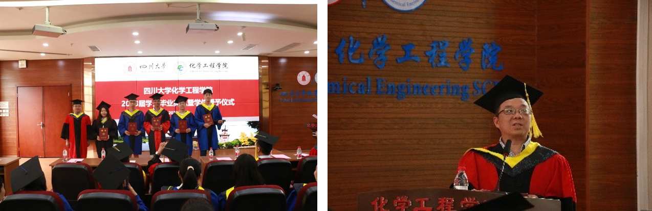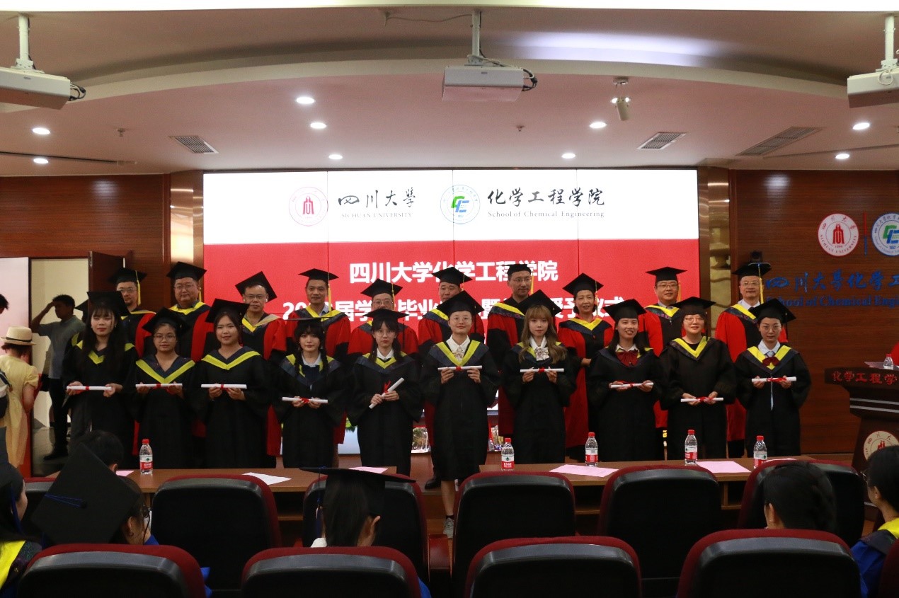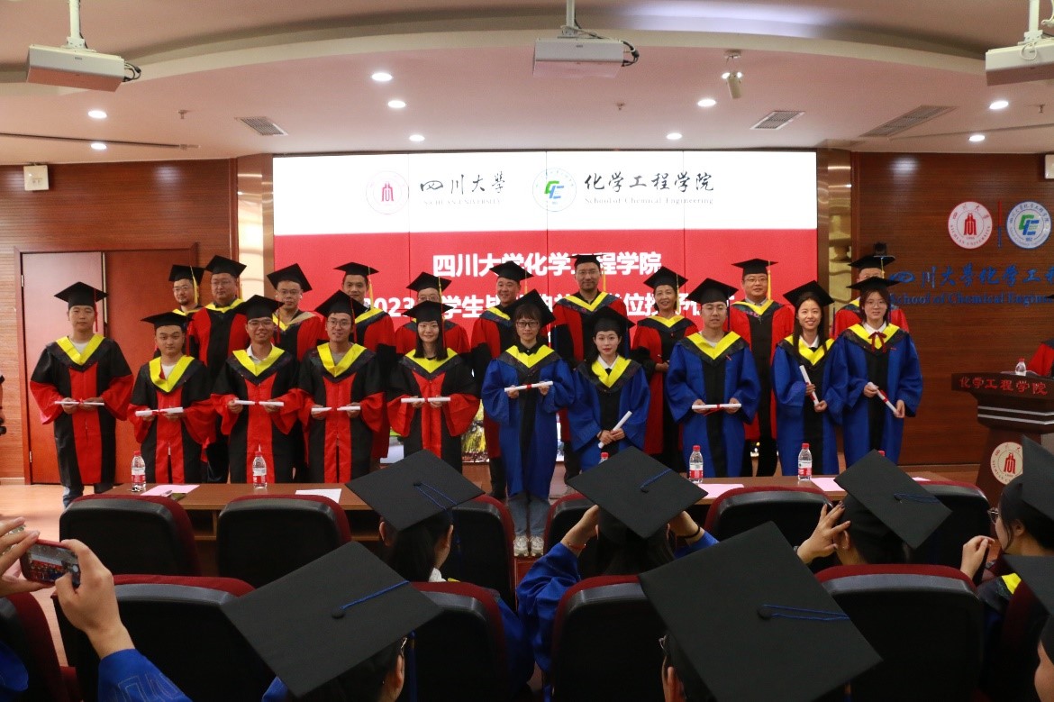 2023届毕业典礼暨学位授予仪式在望江校区化工学院楼313报告厅隆重举行。学院党委书记李天友、院长郭孝东、副书记李德富、副院长唐盛伟、副院长钮大文、工会主席穆畅道、过程装备与安全工程系主任伍勇、国家工科基础课程化学教学基地主任朱权、化学工程系副主任党亚固、制药与生物工程系副主任刘文彬、学生教导员李川娜老师、本科生辅导员老师帕哈尔定,研究生辅导员老师李颖丽,NT动漫