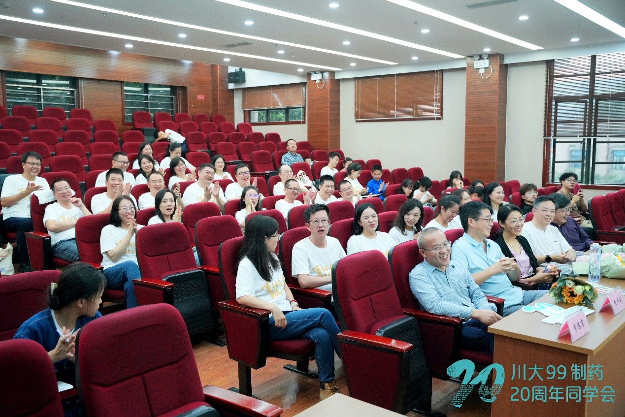 开场致辞,他表示学院欢迎毕业的同学们常回来看看。班会也邀请到了时任专业课教师的庞国伟、马丽芳、邓勇、李子成、承强、兰先秋六位老师,师生们在一起追忆往昔时光,共叙校园情谊,欢声笑语不断传出教室。在“2023问,2003答”这个互动环节里,师哥师姐们给目前在校的本科生代表对于就业还是深造等疑问一一耐心作答。班会的最后一个环节是亲子主题的“小药人”科普讲座,两位从事药物研发和生产的同学,通过视频和实物结合的方式,给到场的小朋友深入浅出的讲解了药品生产和上市的过程。