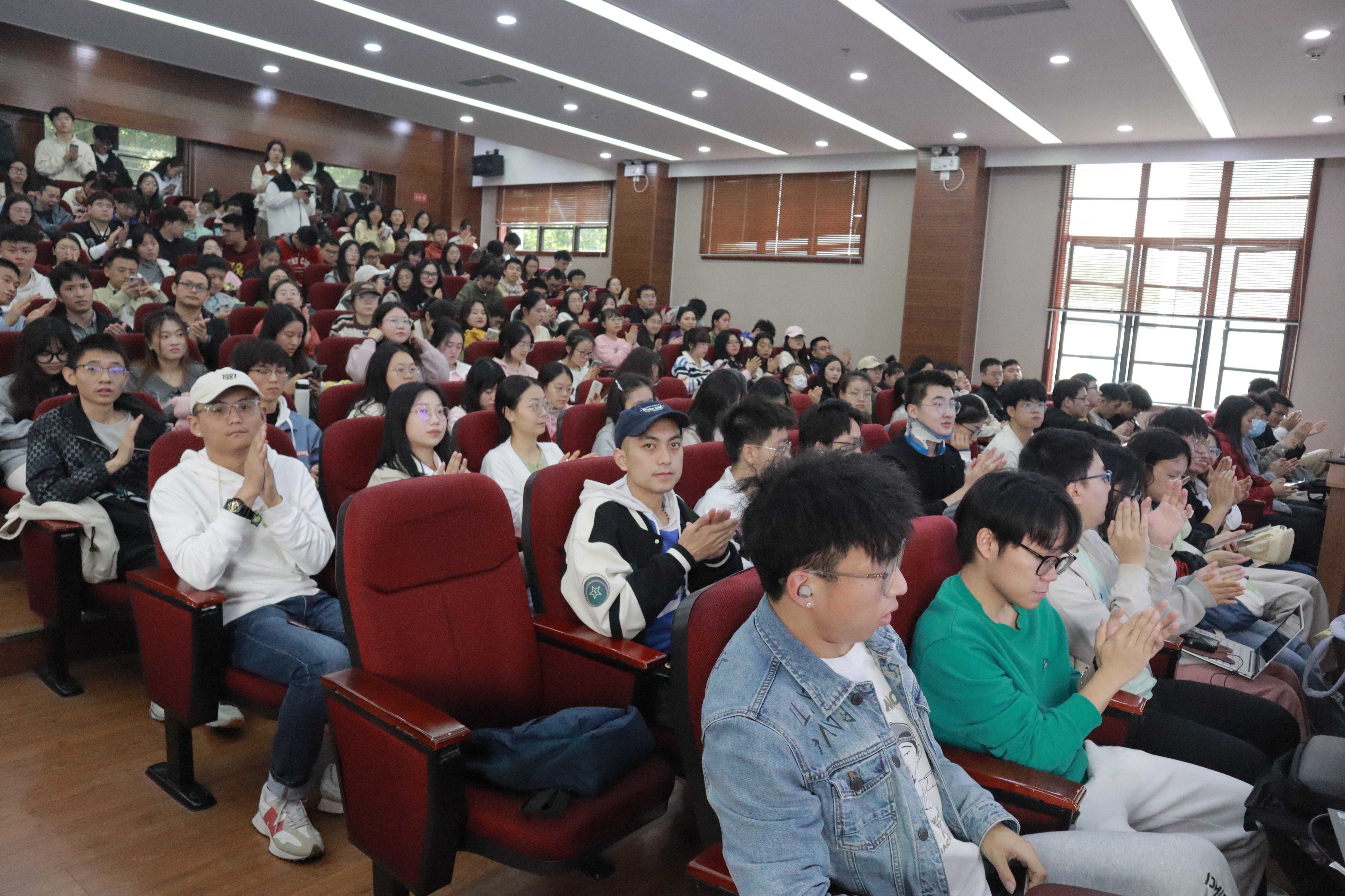 随后汤老师为在场的研究生同学们给出了诚恳的建议:第一、积极自我暗示;第二、主动与人交流;第三、调整预期;第四、适度运动。同时汤老师以自己求学时的经历为例,用轻松诙谐的语言向同学们展示了这几点建议的可行性,例如积极的自我暗示即告诉自己改变能改变的,接受不能改变的;主动与人交流,特别指与导师真诚交流,如实提出自己的诉求,与导师积极磨合;调整预期即是指过去取得的成就就留在过去,而现在又是一个全新的起点,不与他人比较成功与否;最后适度运动,其可以使我们从不断的思考中短暂地解放出来,从而给大脑一个休息的时间。最后,在一片笑语中,讲座圆满结束,老师和同学们依次有序退场。