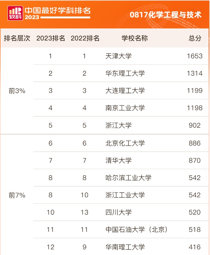 “化学工程与技术”学科位列全国高校第10、综合类大学第4,在2022年全国第13的基础上再上新台阶,连续两年入选中国一流学科。