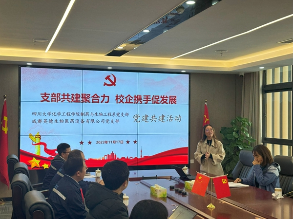 首先,制药与生物工程系党支部与成都英德生物医药设备有限公司党支部在其成都市龙泉驿区的生产基地开展支部共建活动。成都英德生物医药设备有限公司党支部委员、公司总经理韩飞飞对参加共建交流活动的老师们表示了热烈的欢迎。在公司工作人员的带领下,老师们参观了公司生产车间、公司党员岗位创新突破项目成果展。随后,双方介绍了各自党支部的基本情况和党建活动的特色,围绕如何深入开展学习贯彻习近平新时代中国特色社会主义思想主题教育,如何有效促进双方在产学研各方面的协作发展等内容展开了积极的讨论。