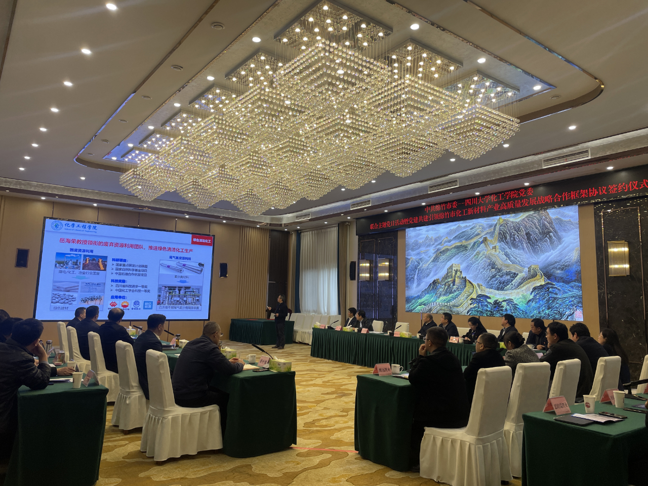 会上,川大化工学院副院长唐盛伟介绍了化工学院的历史、专家团队的业务范围和待转化的成果。绵竹市委副书记孙武介绍了绵竹化工产业情况,并代表绵竹与川大化工学院党委副书记兼纪委书记李德富签订了《党建共建引领绵竹市化工产业高质量发展战略合作框架协议》,聘请了吉旭、袁绍军、巨晓洁、黄青松、谭帅等18名专家为绵竹市绿色化工产业发展顾问,并为专家代表颁发了聘书。
