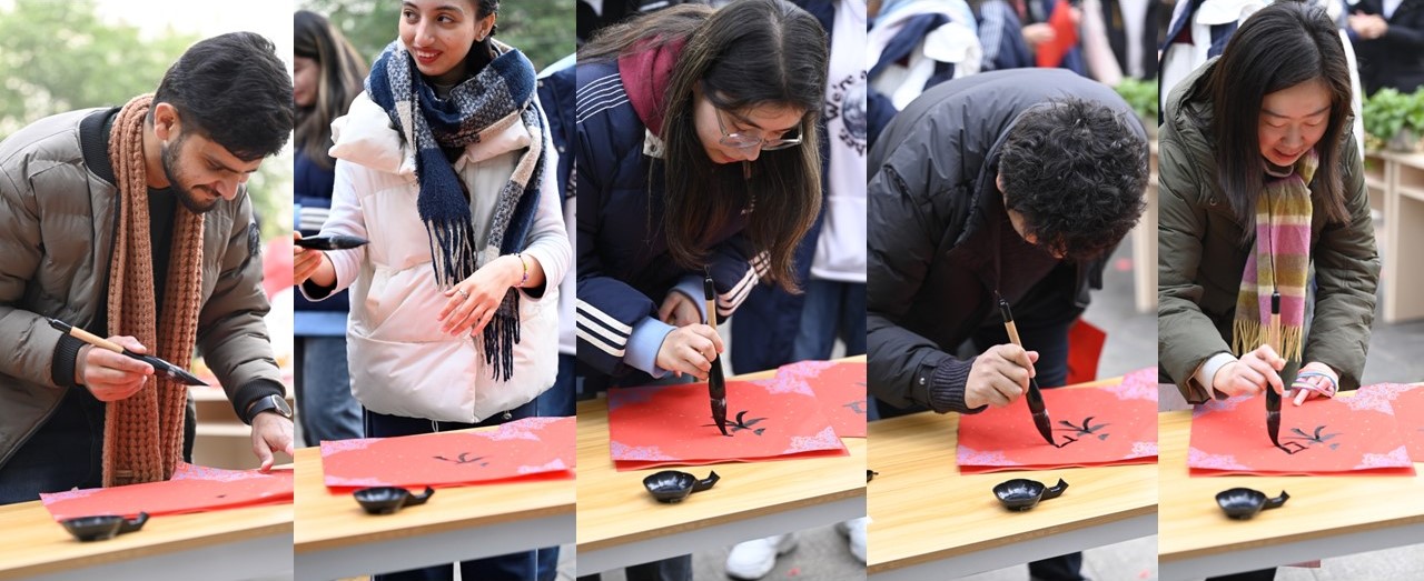 剪纸结束之后,同学们开始挥洒墨水,在红纸上写起了新春祝福,一个个“福”、“过”、“发”和“和”字分别代表了同学们在新年里的美好祝愿。留学生们也努力学习起来,一笔一画勾勒出“福”字。最后,留学生、港澳台学生和其他学生以及老师们一同写下了“和”字。