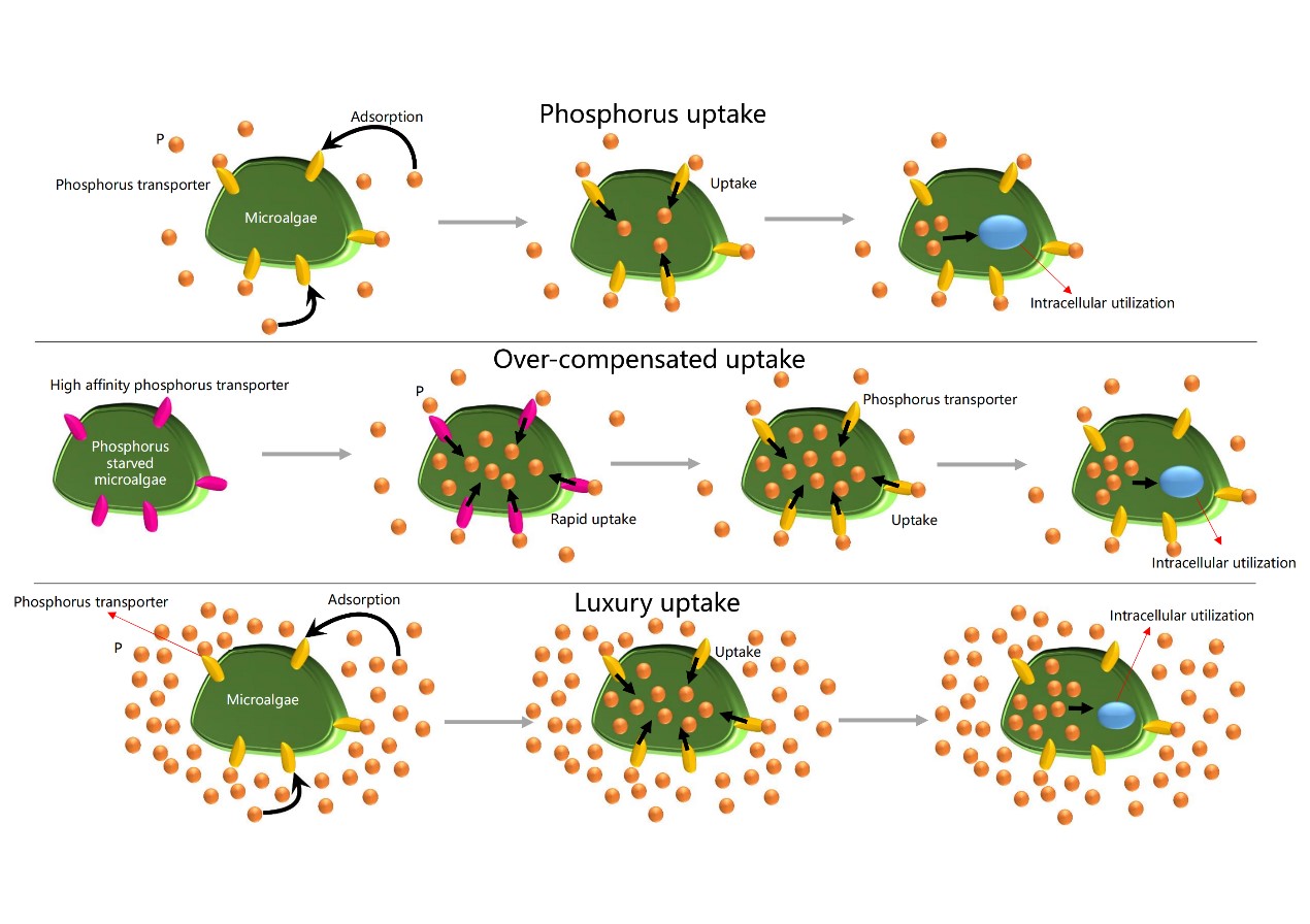 相比于物理和化学方法,微藻除磷更具有环境友好性,富磷生物质在磷肥和催化剂生产方面作用重大。此外,相比于纯藻除磷,混藻除磷和藻菌混合除磷对其他污染物具有更好的协同去除作用。为提高微藻的除磷效率,有必要了解微藻除磷与利用的机理,包括常规磷吸收、过补偿吸收和奢侈吸收(如图2、3所示)。
