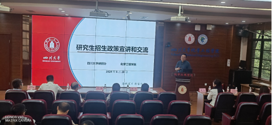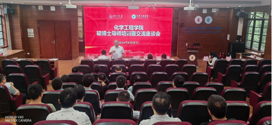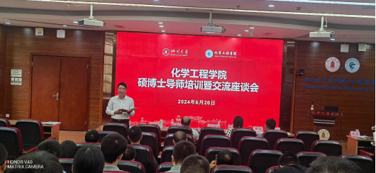 在望江校区化工楼313会议室举行硕博士导师培训及交流座谈会。学校研究生院招生办公室刘猛、研究生院招生办公室李洁科长、研究生院培养教育办公室黄云科长受邀出席活动。学院党委书记李天友、院长郭孝东、党委副书记兼纪委书记李德富、党委副书记姜利寒及硕博士导师50余人参加活动。会议由副院长谢锐主持。