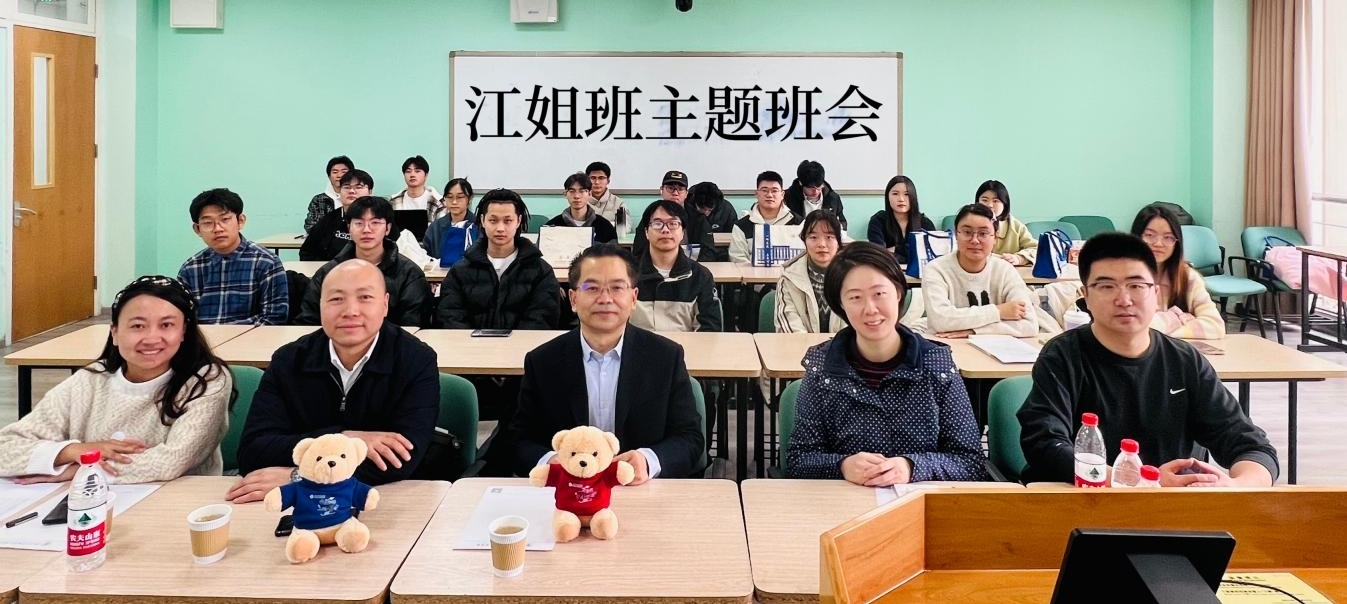 齐唱团歌后,江姐班团支书邱天汇报了江姐班深造就业基本情况、前三年学业成绩以及班团建设成果。褚良银充分肯定了班级的建设成果,并鼓励同学们再接再厉,争取获得更好的成绩。
