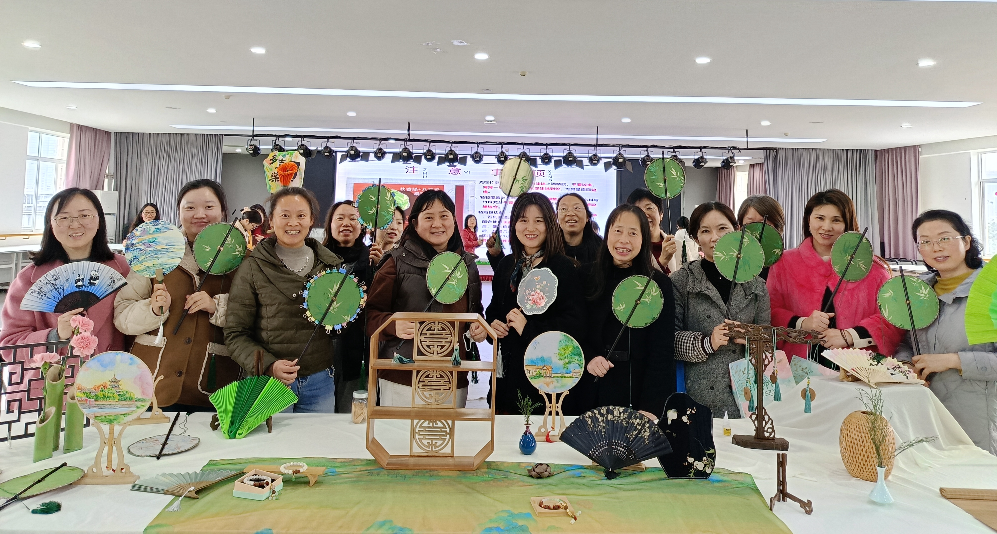 在制作环节,老师们充分发挥想象力和创造力,互相交流制作技巧,分享创作灵感,现场气氛温馨欢乐。经过一个多小时的精心制作,一把把独具匠心的团扇逐渐成形,每一把都凝聚着老师们的智慧与创意。