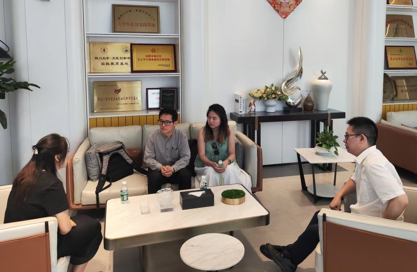 首先,Show教授和Chia研究员到成都医学城-三医创新中心的产业园区中心,与园区技术管理人员进行了交流。Show教授曾任马来西亚国际生物过程学会的前主席兼创始人,现任诺丁汉大学马来西亚可持续食品加工研究中心主任和马来西亚未来食品灯塔卓越中心联席主任,主要从事生物工程上下游相关技术的研究。Wen Yi Chia在南洋理工大学环境与水研究中心工作,也隶属于新加坡膜技术中心,主要从事生物废弃物资源化利用和膜技术相关研究工作。