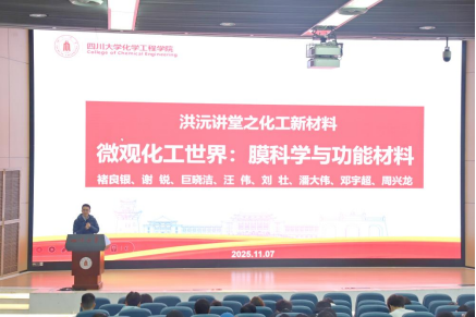 在江安校区第一教学楼水上报告厅举办洪沅讲堂“微观化工世界——膜科学与功能材料”专题讲座。本次讲座由膜科学与功能材料研究室汪伟教授主讲,刘壮教授参与交流,2025级全体本科生参与。