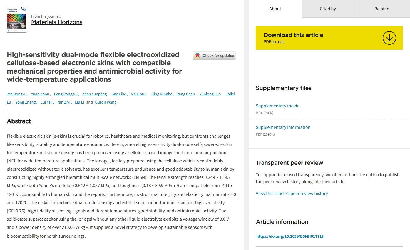 为了进一步提高固态电解质的柔韧性和温度使用范围,研究团队构筑了高度交织层级多尺度网状结构离子凝胶,在-100~120ºC有好的结构完整性和力学性能,将其与碳布组装成全固态超级电容器,在无添加任何液态电解液和无外界压力的情况下功率密度达到210.00 W·kg−1,经过5000次充放电循环后仍保持好的电极/电解质界面和电解质结构完整性。而且,该凝胶固态电解质也表现出好的应变与温度传感性能及抗菌性,为下一代快充电源和可穿戴自供电电子设备的开发提供了新策略。相关研究成果发表在《Materials Horizons》(//doi.org/10.1039/D5MH01771H)上,该论文第一作者为NT动漫
