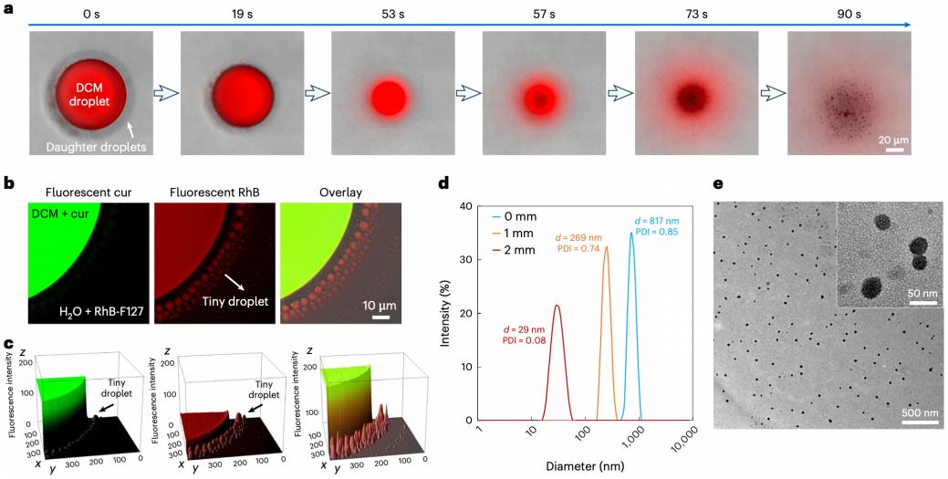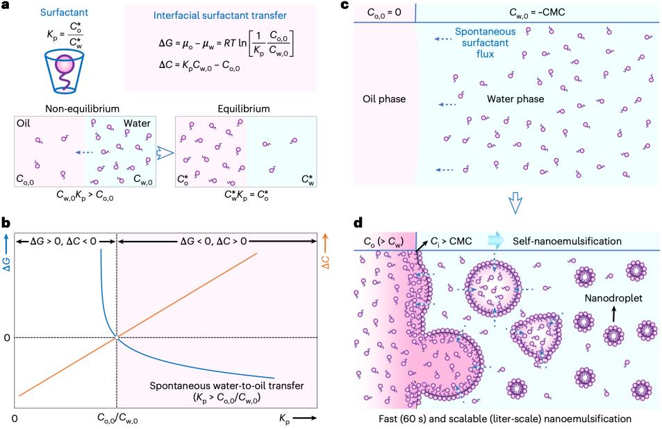 团队研究发现,在油水相体系中处于非平衡分配状态的表面活性剂分子会自发进行快速相际传质,从而诱导界面不稳定性、导致自发纳米乳化现象。通过深入研究表面活性剂分配特性、界面活性和分子结构等对该纳米乳化分散的调控规律,团队实现了每分钟5升均一纳米乳液的快速可控制备。