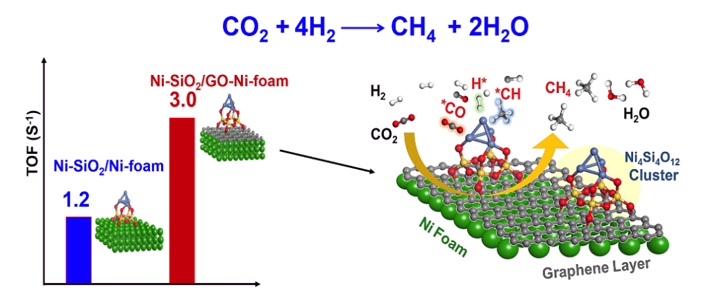 近期,研究团队理性设计与合成了金属泡沫基三明治结构的Ni-SiO2/GO-Ni-Foam纳米催化剂用于CO2加氢甲烷化反应,利用石墨烯插层结构促进在金属泡沫表面形成稳定的硅酸镍活性组分,通过DFT模拟结果证实了插层结构的引入可以提高CO2分子在Ni团簇的吸附能、降低CO2裂解为CO分子与O原子和H2解离为2H原子的能垒。同时利用金属基底的导热特性及时的移除反应热,有效地抑制了高温反应条件下的碳沉积,实现了高温反应条件下的活性与稳定性大幅提升,研究对加氢催化剂的研究提供良好的借鉴作用。