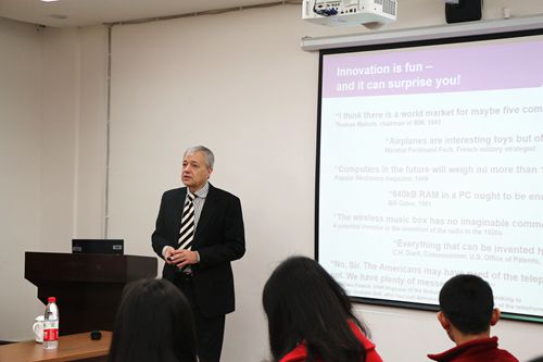 随后举行了赢创工业集团与化工学子的见面交流会。Dr. Peter Nagler以“赢创工业集团是全球最具有创新性的公司之一”为主题作了报告,介绍了赢创工业集团的产品分布,全球经营状况,布局与战略,人才培养模式以及人才引进方式等。报告得到了在座同学的热烈响应,现场同学就如何面临求职失败的遭遇、赢创工业集团是否有意向进军电动汽车领域、赢创赢家俱乐部在NT动漫
