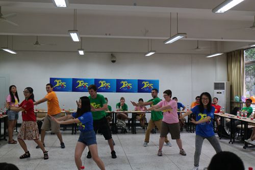游戏”击鼓传花”进行当中,中外学生时常打破表演者的接界定,他们都情不自禁的一起共同演唱起来,有中文歌曲、有英文歌曲,还有共同表演的中国太极,联欢现场的高潮跌荡起伏,气氛活跃,掌声不断。