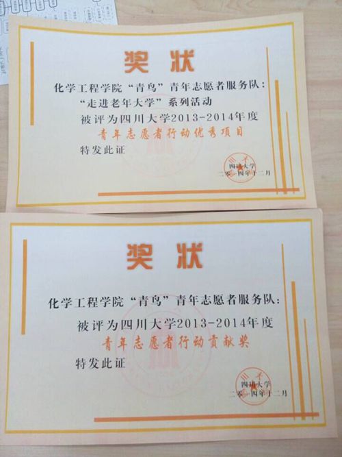 “青年志愿者行动优秀项目”及“青年志愿者行动优秀奖”两个奖项。化工学院的各位志愿者的辛勤工作得到了肯定,但化工学院的志愿者并不满足于此,他们将会加倍努力,争取更大的进步;也希望全院同学积极参与志愿活动,贡献光和热。