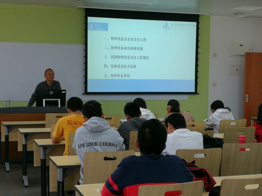 2018年10月25日下午,四川省特种设备安全管理协会常务副会长吕涛总工程师在江安校区一教A601为过程装备与安全工程系新生开设了一场“设备安全及安全工程”讲座。吕会长首先介绍了特种设备安全管理的目的与重大意义,结合自已近四十年的一线工作经验,用生动的案例和易懂的语言,对特种设备的生产、经营、使用、检验检测及监督管理进行了全面的介绍和分析。吕会长将我国和世界范围内的压力容器、锅炉、压力管道等特种设备的安全现状与管理模式与同学们进行了分享,通过西安液化气爆炸事故、宜宾“7.12”重大爆炸着火事故、湖北当阳重大高压蒸汽管道裂爆事故等安全事故案例解析,使同学们认识到学好专业知识的重要性及过程装备与控制和安全工程专业的广阔发展前景。