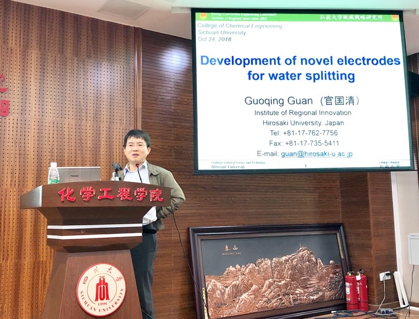 官国清教授向在场师生简要介绍了弘前大学及其课题组的基本情况。官老师介绍了氢能是最为理想的清洁能源,在能源危机的大背景下许多科研人员都从事氢能及氢燃料电池的相关研究。日本的氢燃料电池发展一直走在国际前列官教授就日本氢燃料电池的发展概况介绍了氢燃料电池新型水裂解电极的相关研究现状。为了解决电解水的过电压问题,官老师着重介绍了其课题组涉及电解水的新型电极材料及制备方法等工作。官教授的报告激起了师生的浓厚兴趣,现场师生认真聆听官教授的报告。报告结束,官国清教授和现场师生进行了热烈交流,他耐心地回答了老师和同学们从能源利用、未来能源发展、专业认同感等多方面的问题,学术气氛非常浓烈。