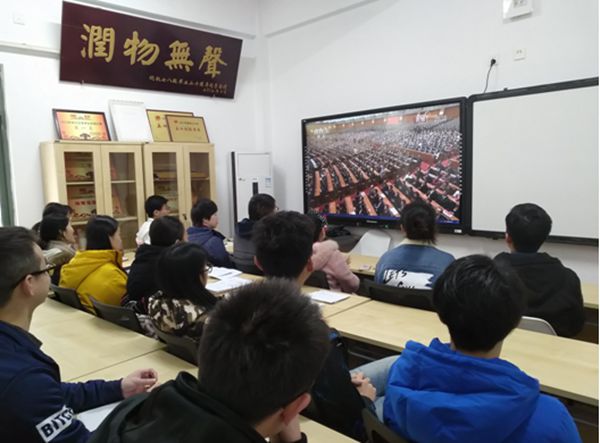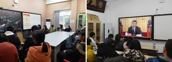 师生在江安三舍党团活动室观看大会直播)