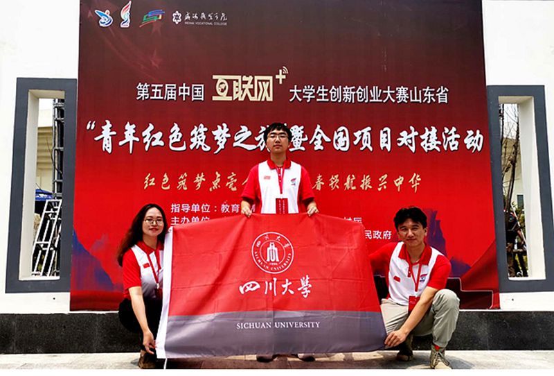 图片说明:王卫团队成员张建霞(左一)作为川大学生代表在活动开幕式的合影