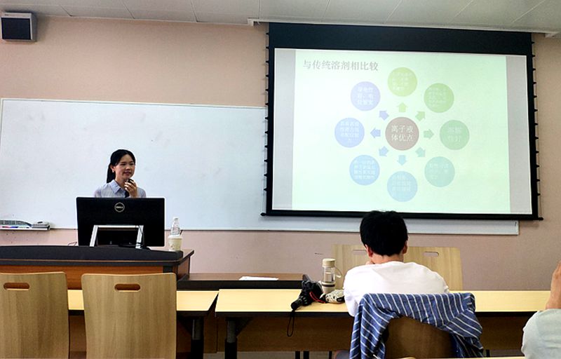 国际周制药与生物工程学科前沿课程第六课开课。本次课由来自湖南师范大学生命科学学院的丁雪沁老师为制药工程与生物工程的同学们讲授设计师溶剂-离子溶液的相关知识内容。