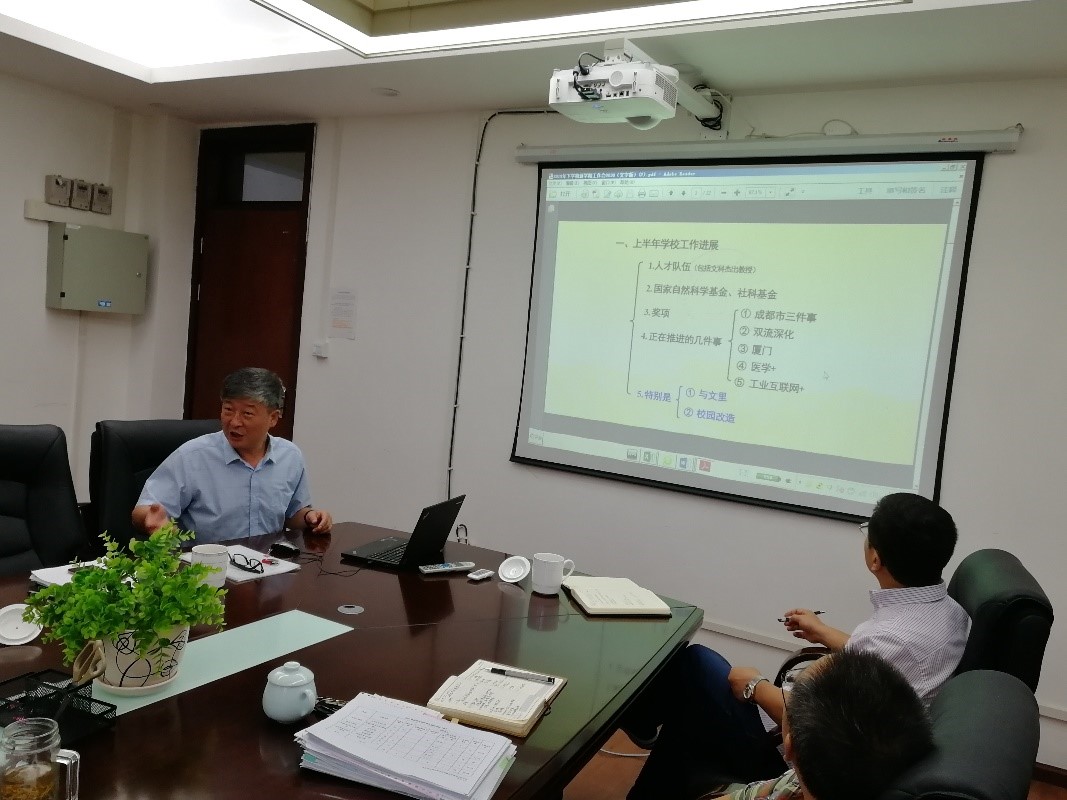 庞书记说到,30日下午,学校召开了新学期工作布置会,王建国书记对学校上半年发展情况进行了总结,李言荣校长对准双一流建设目标,提出了发展中存在的问题,并指明了学校下一步前进方向。李言荣校长在报告中,分析了各学院的综合评估及排名情况、国家自然科学基金和ESI贡献度情况。结合学校目前的发展情况,提出了抓人才、抓医科、抓特色、抓交叉、抓空间、抓激励、抓氛围的七个抓手,指出要梳理核心竞争力,在教师中营造追求卓越、敢于竞争的氛围。整个部署会给全校师生鼓足了干劲、提振了士气。