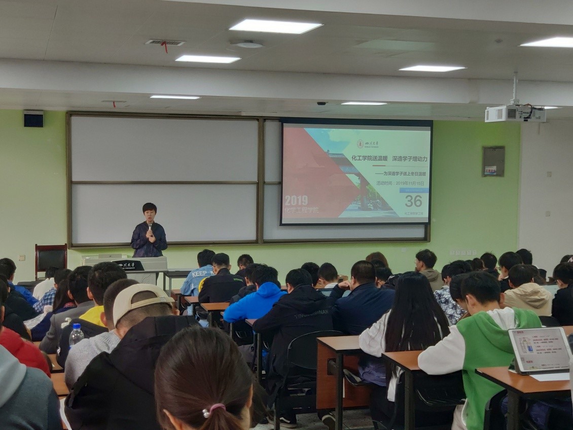 2019年11月15日中午1点,“化工学院送温暖 深造学子增动力”活动在江安校区一教楼B103成功举办,化工学院党委副书记姜利寒,辅导员王苏宁,兼职辅导员周建军、李银桥为NT动漫