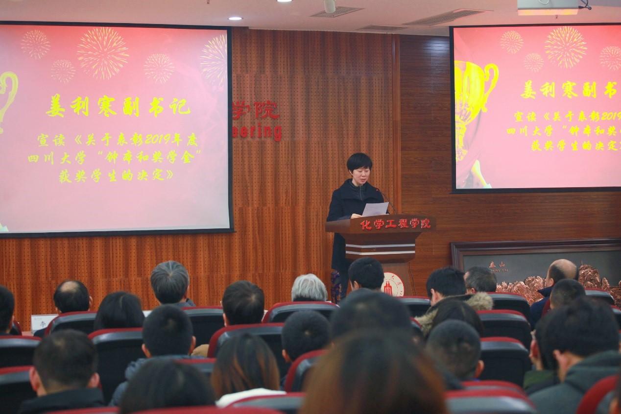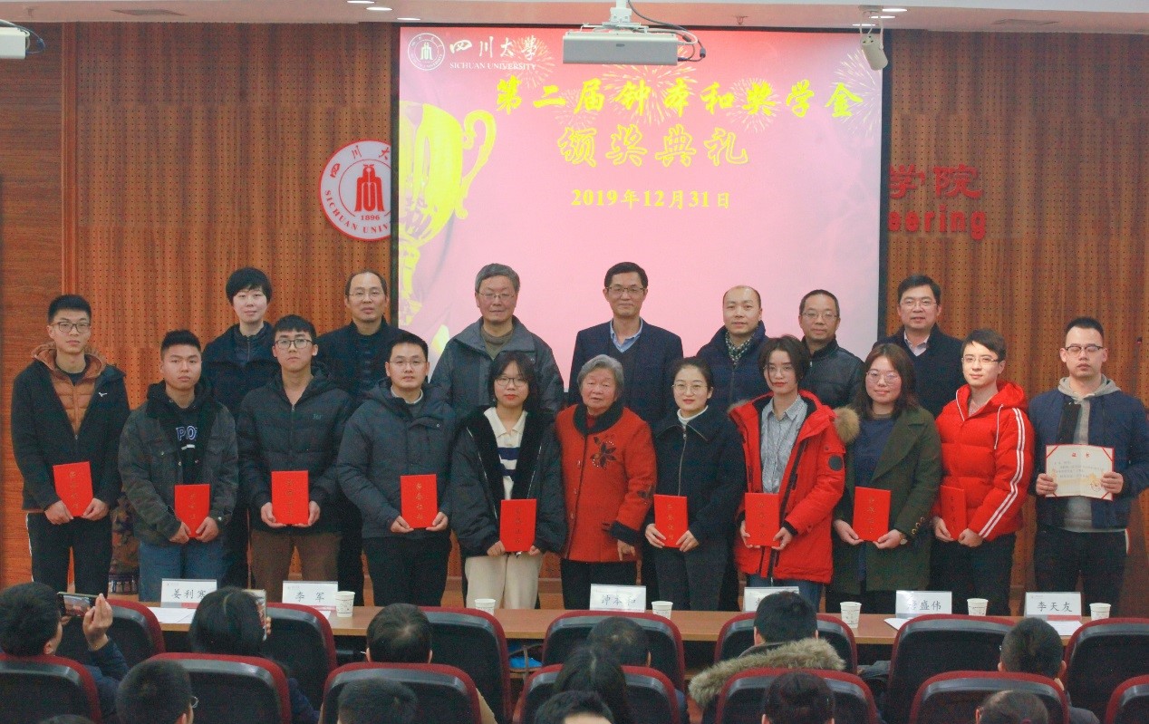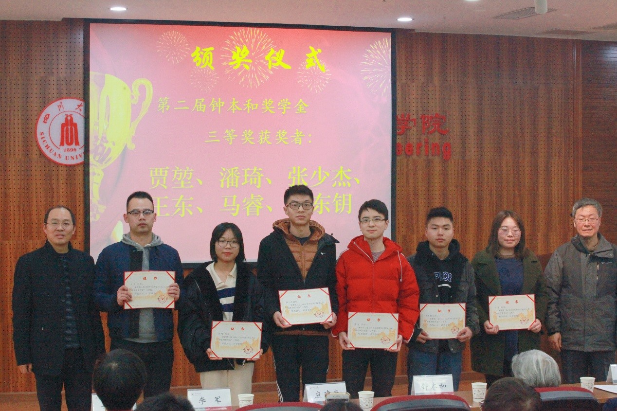 “钟本和奖学金”获奖学生的决定》。在老师和同学们热烈的掌声中,赵院长、李书记、唐院长、姜书记等与会领导和磷化工团队应建康、李军教授分别登台为10位获奖学生颁发奖状,并合影留念。2017级博士研究生许德军代表荣获第二届“钟本和奖学金”获奖学生发表获奖感言。