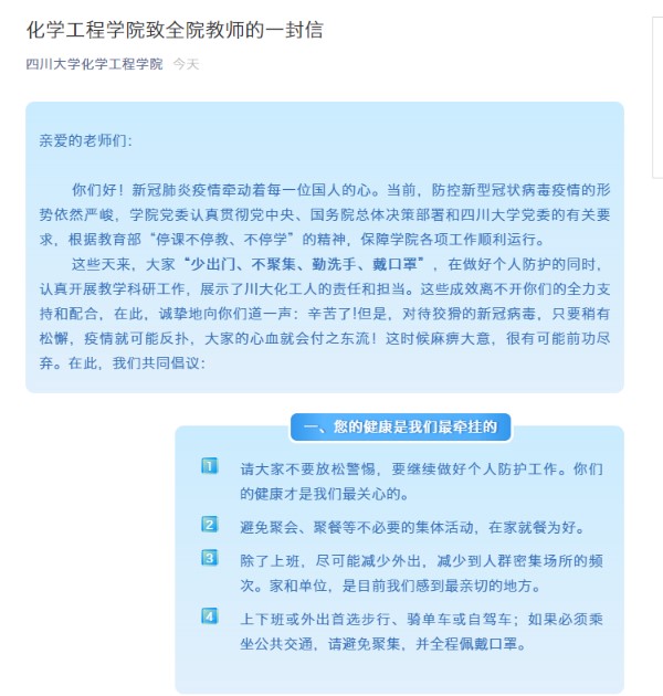 防控新型冠状病毒感染的肺炎疫情工作方案(试行)》,积极配合学校做新型冠状病毒防控工作安排,保证学院师生健康和维护正常工作秩序。