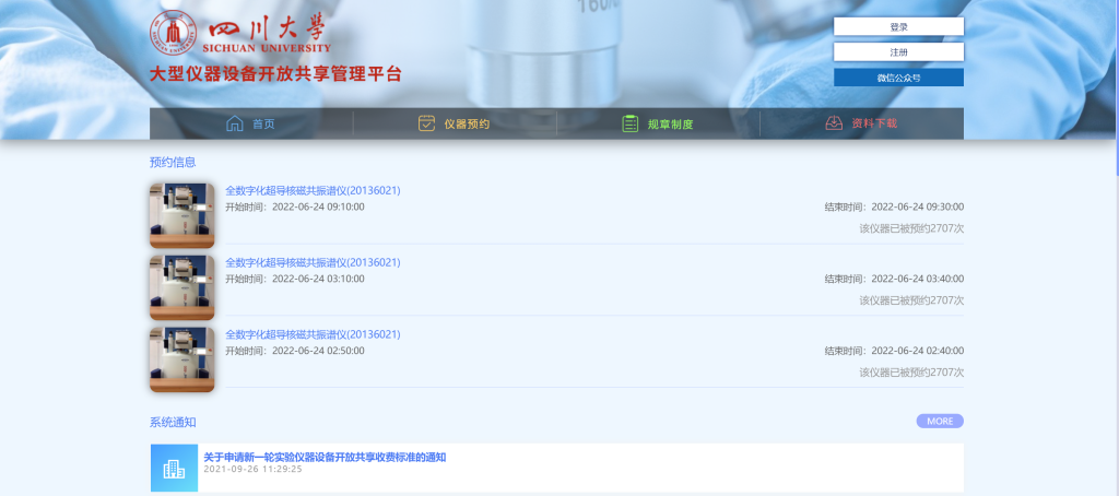 “数据服务中心”系统进行仪器测试预约。