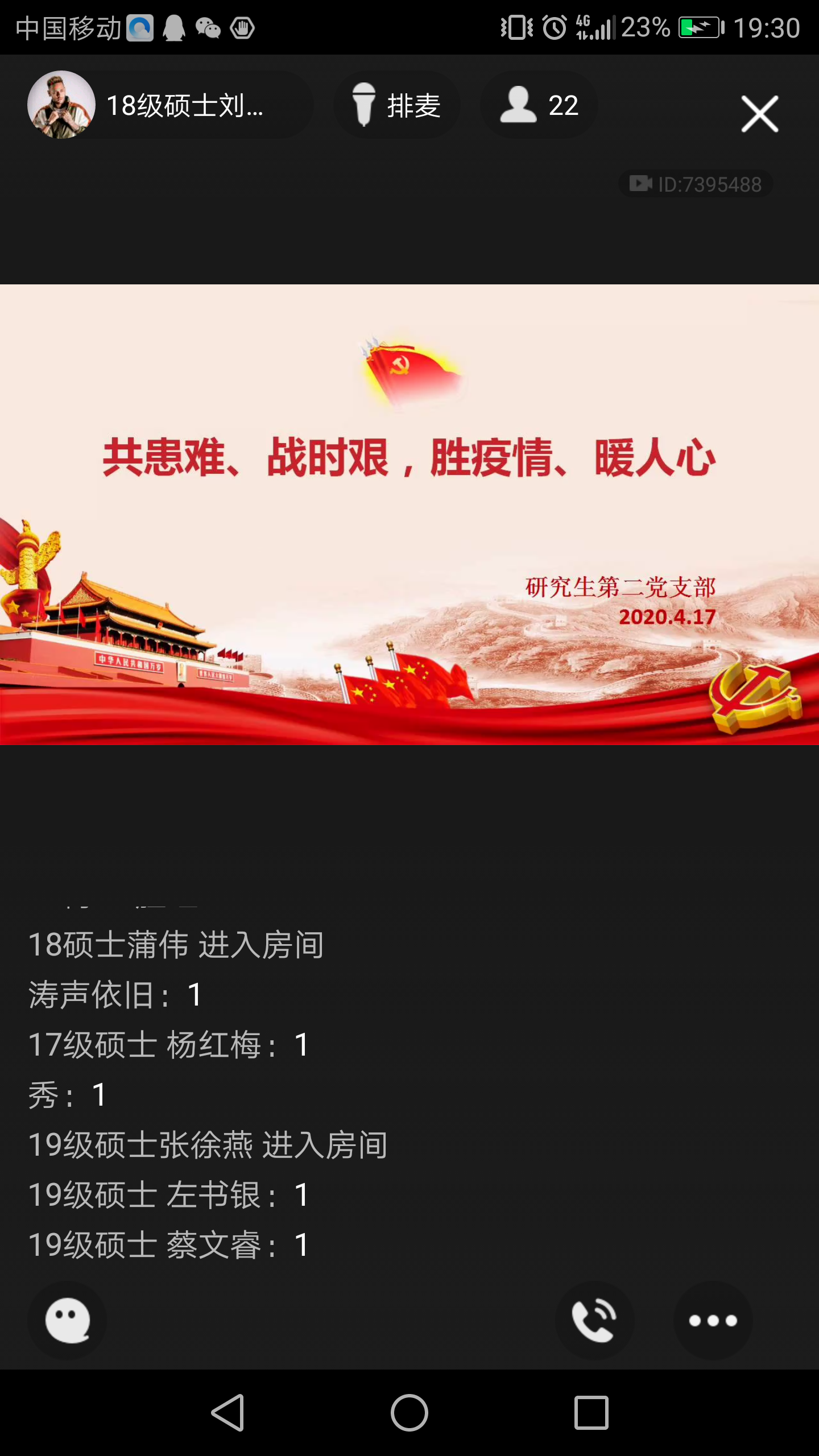 研究生第二支部通过QQ课堂进一步开展“学习党的十九届四中全会精神,为抗击疫情贡献青春力量”会议。会议由支部书记刘郭洁主持。