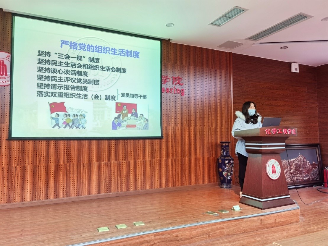 培训会上,高敏老师做了题为《严格落实<中国共产党支部工作条例(试行)>,推进党支部标准化规范化建设》的专题培训。“基层党组织是党执政大厦的地基,地基固则大厦坚,地基松则大厦倾。”高敏老师从习近平总书记在全国组织工作会议上的讲话引入主题,从“学习全国组织工作会议精神、《中国共产党支部工作条例(试行)》精神解读、在巡察反馈意见和支部检查中发现的党支部建设问题和几项具体党建工作的介绍”几个方面,对党支部标准化、规范化建设标准进行了详细说明。培训会明确提出,学院党支部要以提升组织力为重点,突出政治功能,把党员组织起来、把人才凝聚起来、把群众动员起来,做好党中央和学校党委重大任务的贯彻落实,发挥好战斗堡垒作用,按照党建与事业融合发展的思路,围绕学校第八次党代会提出的“两个伟大”目标,牢牢抓住培养社会主义建设者和接班人这个根本任务,为努力建设世界一流化工学院和化工学科做出积极贡献。