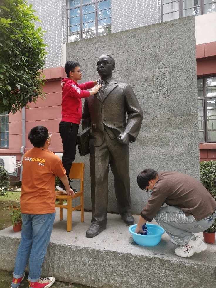 志愿活动中,同学们对雕像本体、雕像平台及四周死角等处进行了全面打扫清洁,清洗后的雕像一尘不染,恢复了往日本色。