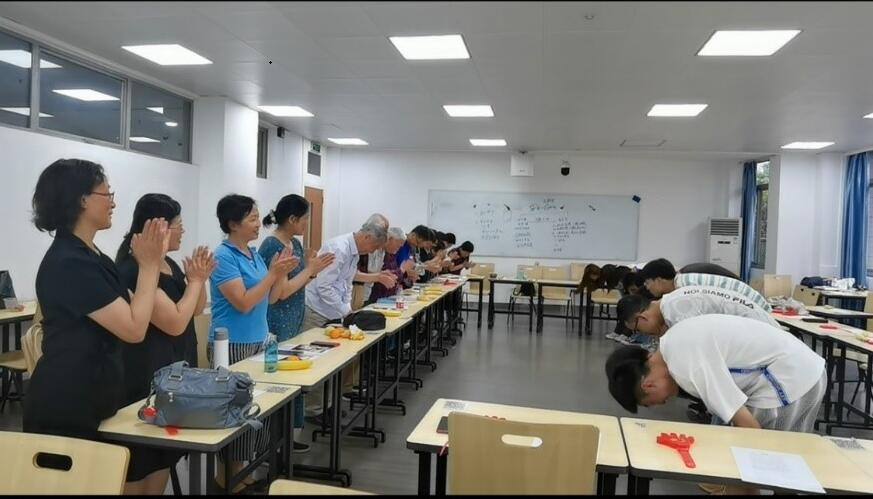 游戏结束后,在茶话会活动现场,安工1班的学生们向在场的关工委老师们送上了亲手写的贺卡,感谢老教师们的用“心”教育、热“心”管理,贴“心”引导,暖“心”服务。同时,学生们手牵手肩并肩向所有老师深深鞠躬并高声呼喊“老师们辛苦了!”