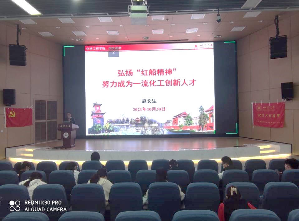 本次的主题主要围绕“红船精神”,首先赵院长便提出了“100年前,中国共产党为什么诞生在上海?”的问题,接着引申到:“100年后的今天又该如何弘扬‘红船精神’呢”?首先,同学们要了解红船精神是红色革命精神之一,指的是开天辟地、敢为人先的首创精神,坚定理想、百折不挠得奋斗精神,立党为公、忠诚为民的奉献精神。第二,结合学院与学科的发展历史,以及最初的办学理念希望同学们能够立足基础、面向工业、服务社会。当今世界正经历百年未有之大变局,新一轮科技革命和产业变革深入发展,国际力量对比深刻调整,和平与发展仍然是时代主题,人类命运共同体理念深入人心,同时国际环境日趋复杂,不稳定性不确定性明显增加,学校更希望同学们传承弘扬开天辟地、敢为人先的首创精神,成为一流化工创新人才。